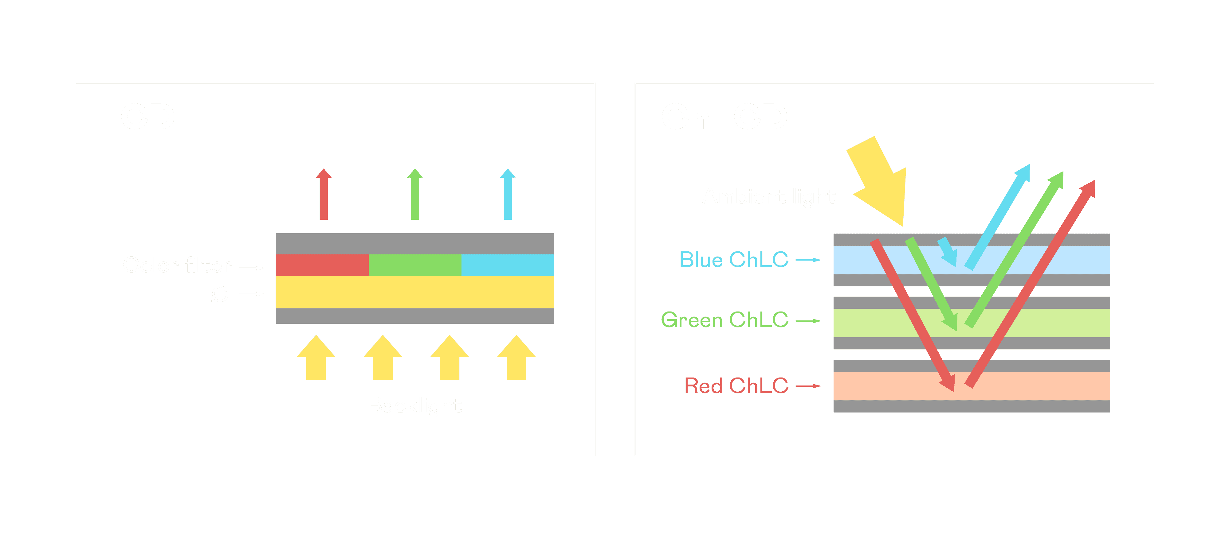口袋牛店胆固醇液晶显示器是由红、、、、绿、、、蓝三层胆固醇液晶面板堆叠而成,,并采用无彩色滤光片设计,,,减少环境光在反射过程中的损耗。。