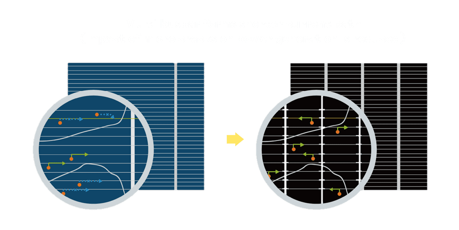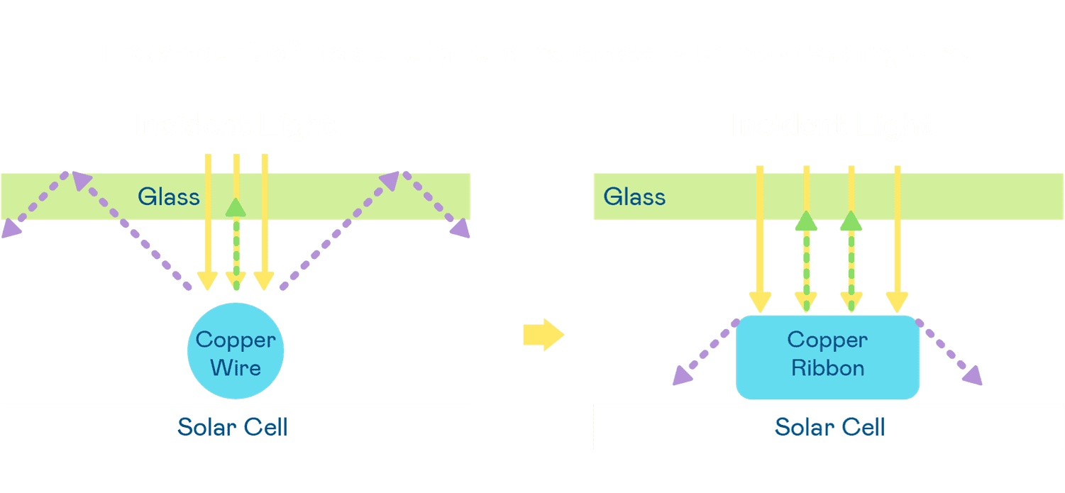 • 电池使用多条铜导线 (Copper wire) 于电池片上形成较短的电流路径,,提高电流收集效率,,,采用圆形设计的铜导线较传统扁平式的铜焊带 (Ribbon),,,,可增加入射至电池的光线量。。