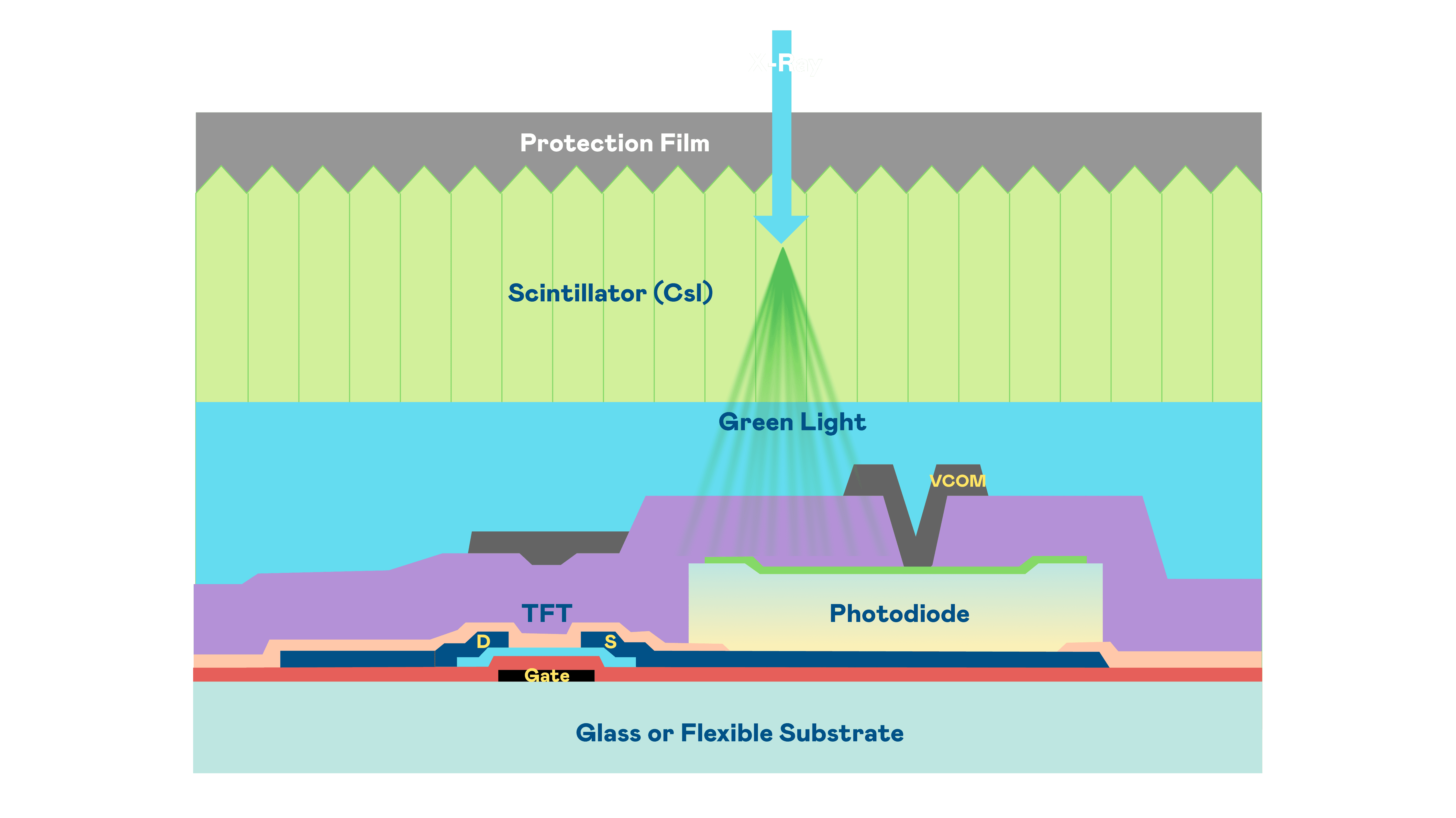 口袋牛店的X光影像感测阵列使用薄膜电晶体 (TFT) 作为每个像素的读取开关,,,,搭配光电二极体(Photodiode)的光电转换元件,,,用以感测X光影像讯号。。